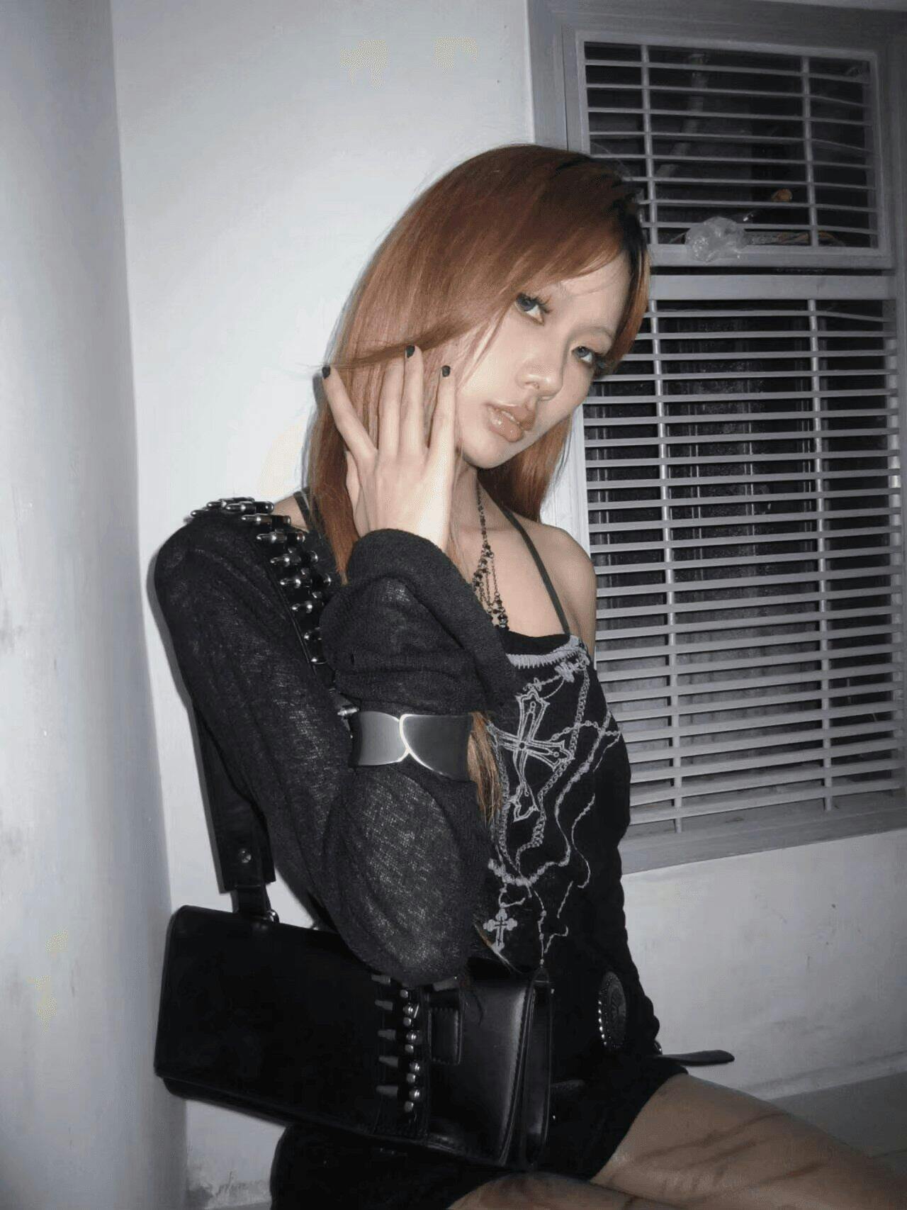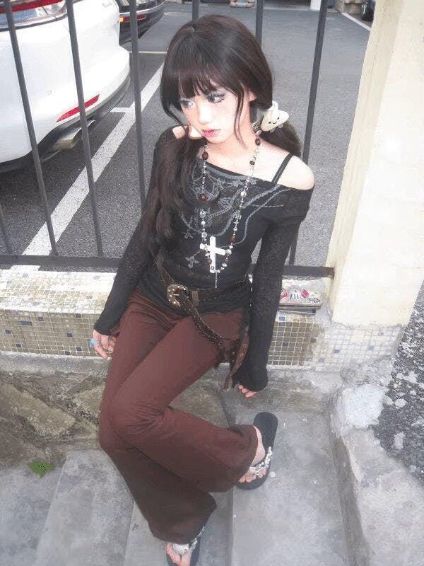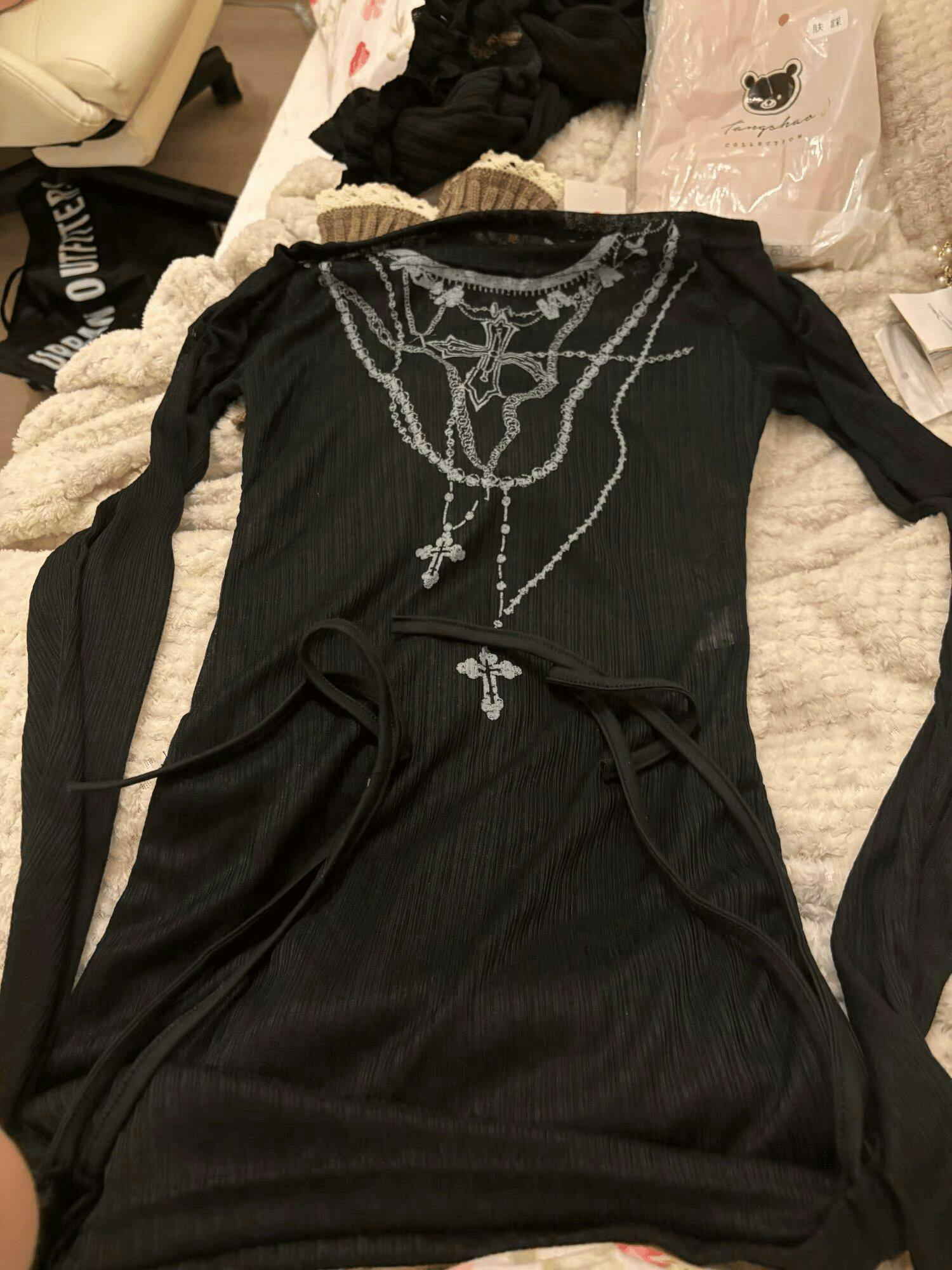 Adoptez une ambiance sombre et audacieuse avec ce haut gothique inspiré des années 2000. Conçu avec une coupe épaules dénudées, il présente des colliers croix imprimés superposés, ajoutant une esthétique grunge à votre tenue. Un incontournable pour les fans de style alternatif.