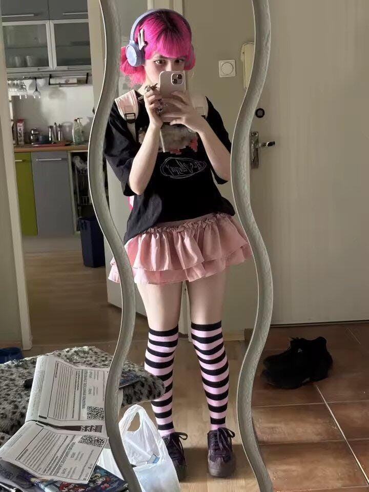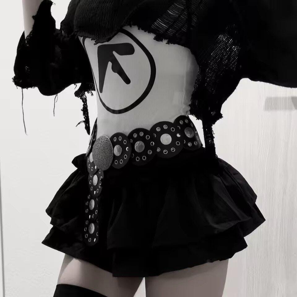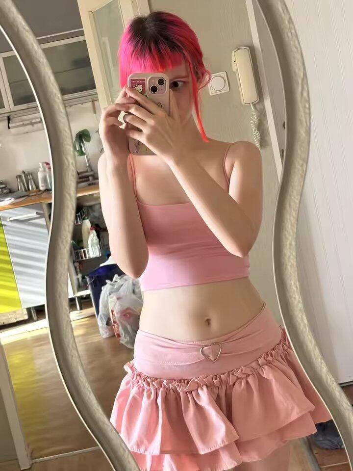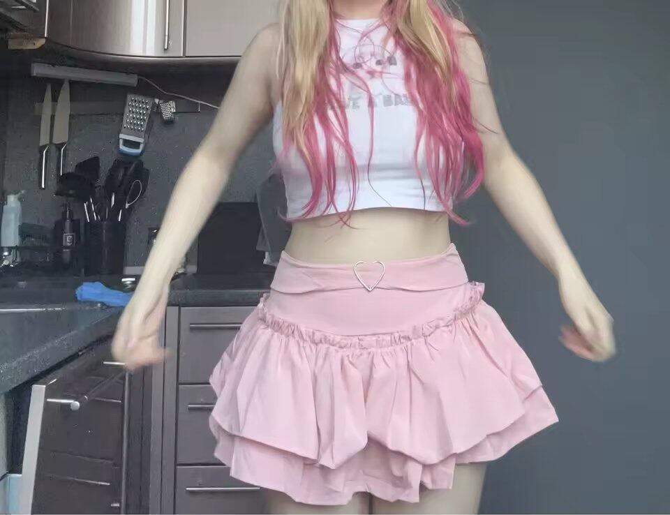 Frilly layers and a heart charm take this ruffled mini to the next level of coquette-core. With a soft pink shade and built-in shorts, it’s playful but practical. Perfect for girlies into ballet, kawaii, or soft Y2K looks, this one turns heads without trying too hard.