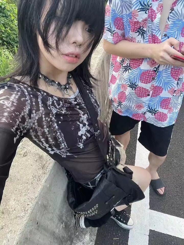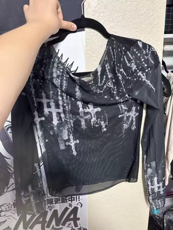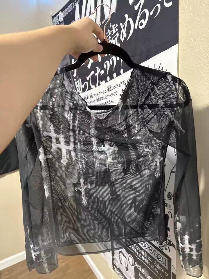 Questa maglia in rete goth Y2K porta atteggiamento e grinta con il suo tessuto trasparente e le grafiche consumate. Il taglio a spalle scoperte e le maniche aderenti offrono un tocco di stile ribelle, mentre il design in rete aggiunge un'atmosfera seducente e trasparente. Abbinala a pantaloncini in pelle o a una minigonna per il contrasto perfetto.