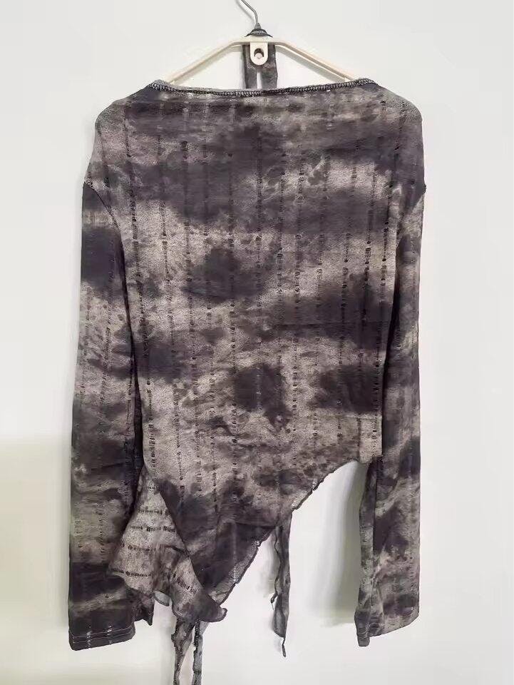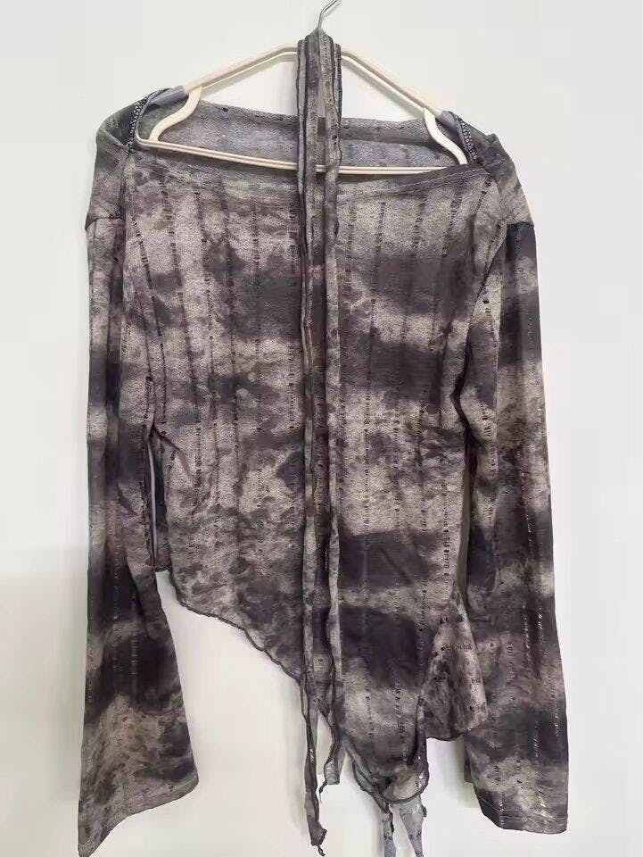 Asymmetrical draped top with distressed edges and an off-shoulder neckline that embodies dark Y2K energy. The layered fabric flows with movement, while the fitted waist creates a sleek silhouette. A bold choice for pairing with mini skirts or wide-leg pants for edgy streetwear styling.