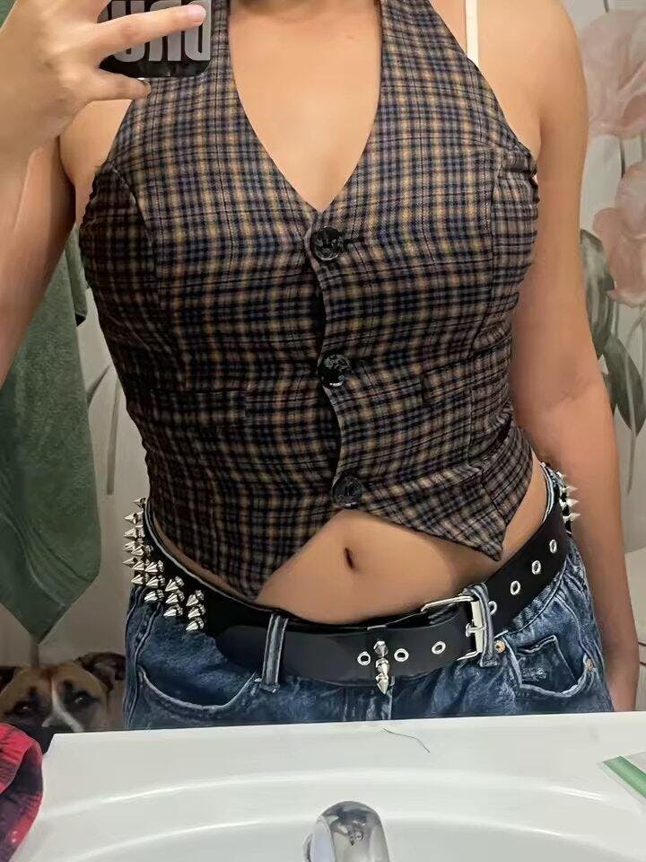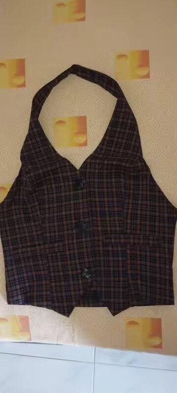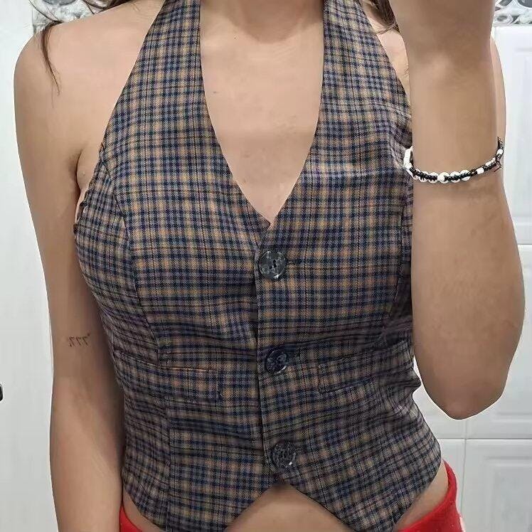A plaid halter vest top that channels edgy Y2K fashion with its fitted cut and button-up front. Designed with a cropped hem and open back, it adds bold streetwear energy to any outfit. Perfect for pairing with cargo pants, skirts, or layered accessories, this piece blends grunge-inspired style with a flattering halter neckline.