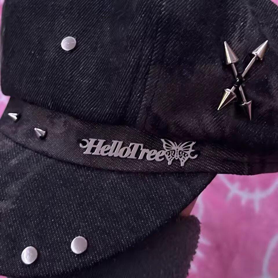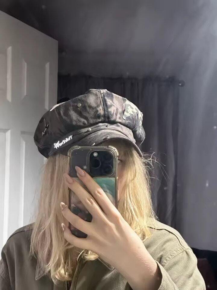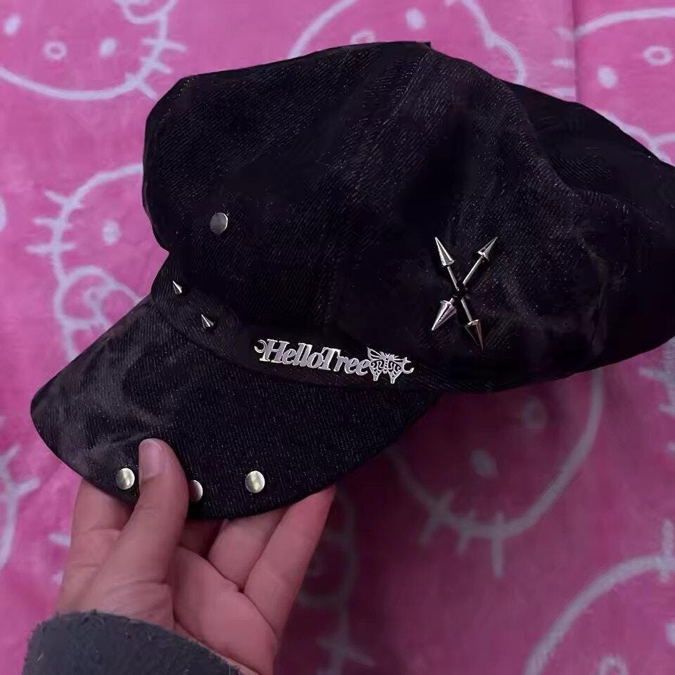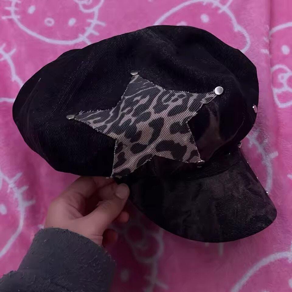 A statement piece for edgy fits, this washed black beret channels true Y2K grunge with its leopard star patch, silver cross pin, and stud details. The distressed texture pairs effortlessly with denim or oversized streetwear, making it a go-to accessory for anyone wanting to stand out in vintage-inspired looks.